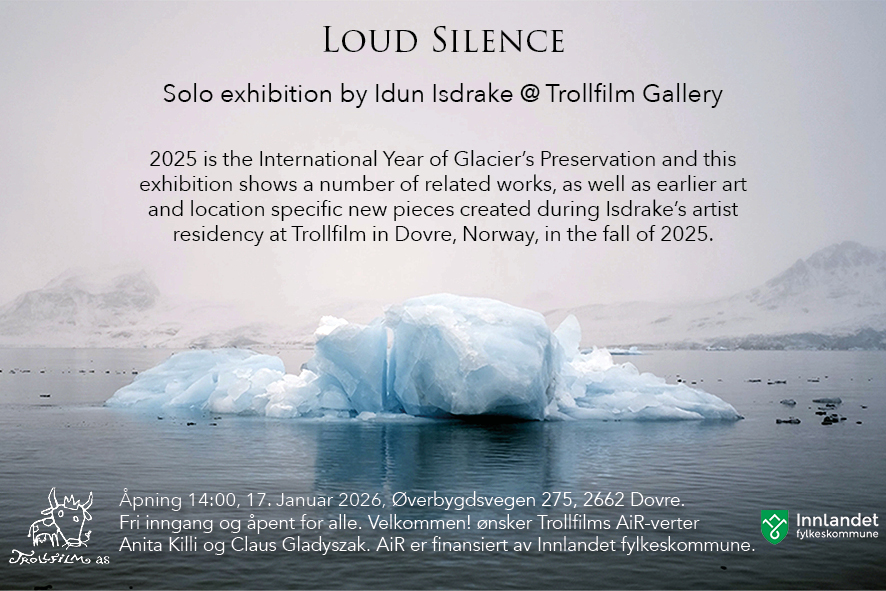 Separatutstilling på Trollfilm Galleri i Dovre. Vernissage lørdag 17. januar 14:00, alle er velkomne, ingen billett kreves. Mer info https://isdrake.no/loud-silence/